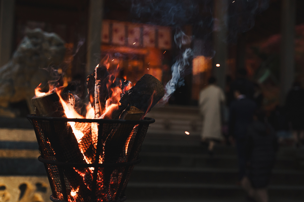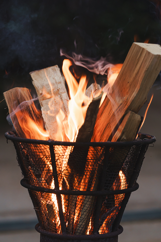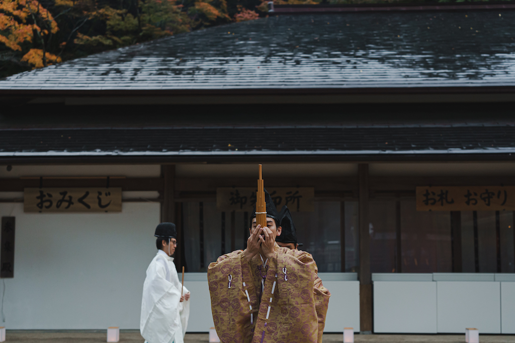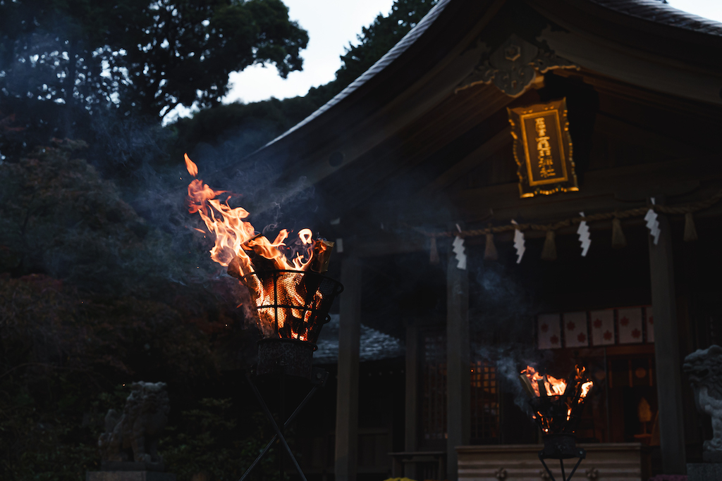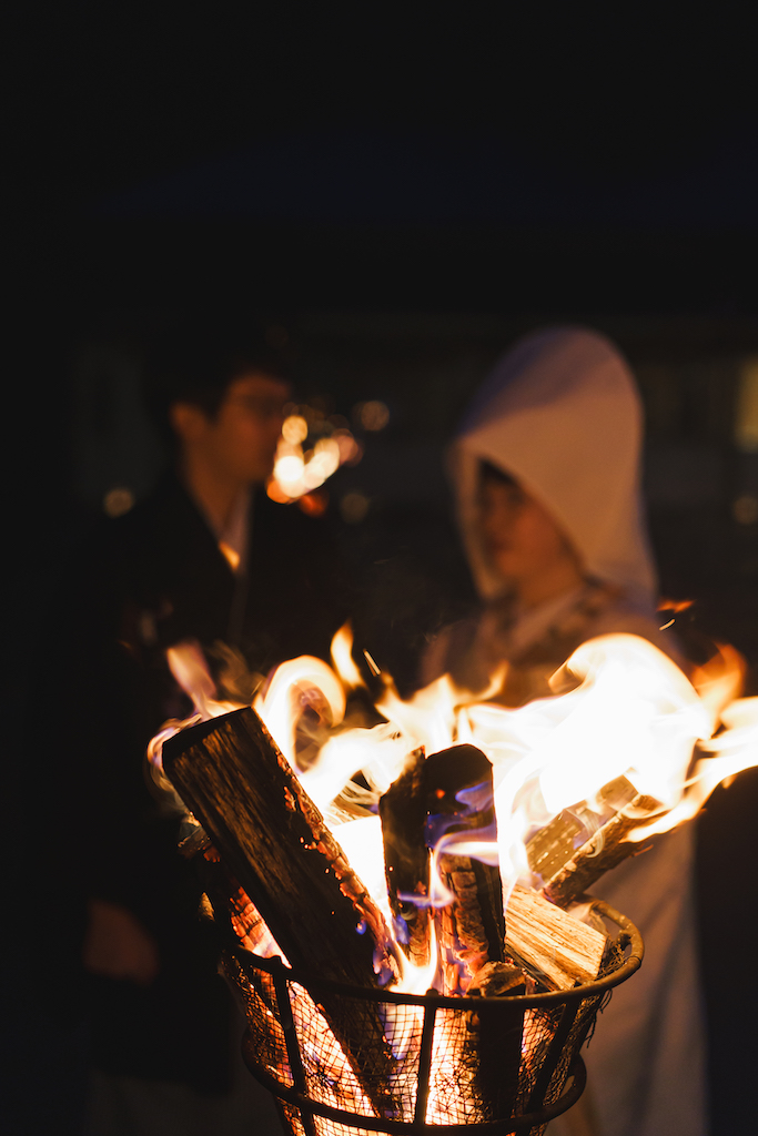 かがり火と雅楽が境内を包み込み、おふたりをやわらかく導きます。